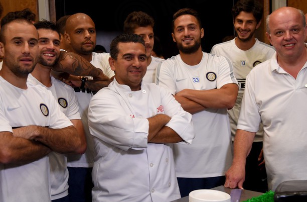 INTER, UNA TORTA SU MISURA – Praticamente tutti conoscono Buddy Valastro – noto al pubblico italiano come “Il Boss delle Torte” dall’omonima serie TV di Real Time -, da oggi anche l’Inter: il pasticcere italo-americano insieme al suo staff ha incontrato i nerazzurri al termine dell’allenamento alla Montclair State University e in serata ha consegnato una delle sue celebri torte presso l’hotel della squadra, che si trova a due passi da Carlo’s Bake Shop, il locale di cui è proprietario. La torta consiste nella nuova maglia nerazzurra firmata Nike, con tanto di pallone sul manto erboso: sorrisi per e con tutti, dal Vice-Presidente Javier Zanetti al capitano Mauro Icardi, passando per l’allenatore Roberto Mancini, che posa anche indossando il camice da pasticcere firmato dallo stesso Buddy.