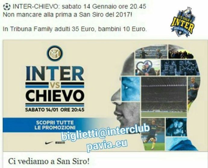 #InterChievo sabato 14/1/17 ore 20.45 #SanSiro Biglietti via #InterClub biglietti@interclubpavia.eu Inter Club C’è solo l’Inter Pavia #TribunaFamily adulto €35 / bambino €10 #InterFans #Inter #DnaNerazzurro #Amala #FCIM from Inter Club C’è solo l’Inter Pavia http://ift.tt/2jnOptF