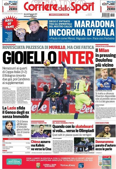 EDICOLA CdS – Gioiello Inter: rovesciata pazzesca di Murillo, ma che fatica Prima pagina del Corriere dello Sport dedicata alla vittoria dell’Inter in Coppa Italia contro il Bologna. Una vittoria arrivata ai supplementari che permette ai nerazzurri di accedere ai quarti: “Gioiello Inter: rovesciata pazzesca di Murillo, ma che fatica. Nerazzurri ai quarti di Coppa Italia(3-2). Il Bologna rimonta due gol, poi Candreva ai supplementari”. [fncvideo id=813031] The post EDICOLA CdS – Gioiello Inter: rovesciata pazzesca di Murillo, ma che fatica appeared first on FC Inter 1908. via FC Inter 1908 http://ift.tt/2juwdkR from Inter Club C’è solo l’Inter Pavia http://ift.tt/2iMFAem