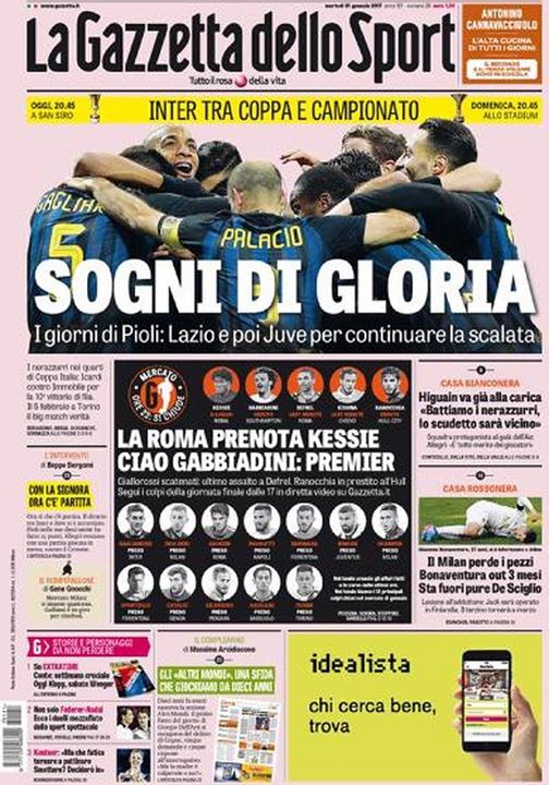 EDICOLA GdS – Sogni di gloria, i giorni di Pioli: Lazio e poi Juve per continuare… Stasera alle 20,45 i quarti di finale contro la Lazio, domenica sempre alle 20,45 la super sfida contro la Juventus in campionato. E’ una settimana cruciale per la stagione dell’Inter e la Gazzetta dello Sport lo mette in evidenza con il titolo di apertura della prima pagina di oggi. “Inter tra coppa e campionato. Sogni di gloria. I giorni di Pioli: Lazio e poi Juve per continuare la scalata”. E nel sommario: “I nerazzurri nei quarti di Coppa Italia: Icardi contro Immobile per la 10^ vittoria di fila, il 5 febbraio a Torino il big match verità”. Beppe Bergomi analizza la sfida con un commento dal titolo “Con la Signora ora c’è partita”. Spazio anche ai bianconeri. “Battiamo i nerazzurri, lo scudetto sarà vicino”, sono le parole di Higuain. The post EDICOLA GdS – Sogni di gloria, i giorni di Pioli: Lazio e poi Juve per continuare… appeared first on FC Inter 1908. via FC Inter 1908 http://ift.tt/2kOtyzl from Inter Club C’è solo l’Inter Pavia http://ift.tt/2kMA3Xv