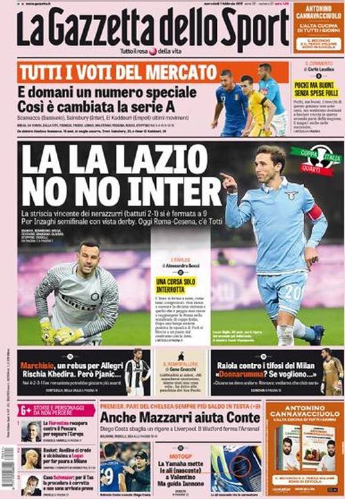 EDICOLA GdS – La La Lazio. No No Inter. La striscia vincente dei nerazzurri si ferma a 9 La prima pagina della Gazzetta dello Sport è dedicata alla sconfitta dell’Inter contro la Lazio nei quarti di finale di Coppa Italia. Così titola la rosea: “La la Lazio. No no Inter. La striscia vincente dei nerazzurri (battuti 2-1) si è fermata a 9. Per Inzaghi semifinale con vista derby”. [fncvideo id=824563] The post EDICOLA GdS – La La Lazio. No No Inter. La striscia vincente dei nerazzurri si ferma a 9 appeared first on FC Inter 1908. via FC Inter 1908 http://ift.tt/2kpOxLW from Inter Club C’è solo l’Inter Pavia http://ift.tt/2jTA0oN