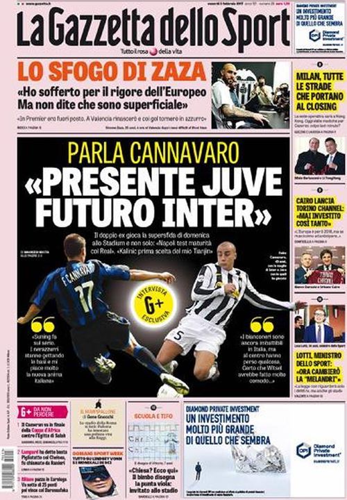 Edicola GdS – Cannavaro: “Inter, Suning fa sul serio. Mi piace l’anima italiana” Sulla prima pagina de La Gazzetta dello Sport, oggi in edicola, viene riportata l’intervista esclusiva realizzata ad un doppio ex del Derby d’Italia. Si tratta di Fabio Cannavaro che ha raccontato al quotidiano sportivo le partite tra Juventus e Inter, soffermandosi sulla situazione attuale dei due club. “Presente Juve, futuro Inter. Suning fa sul serio. I nerazzurri stanno gettando le basi e mi piace molto questa nuova anima italiana. I bianconeri sono ancora imbattibili in Italia, ma al centro hanno perso qualcosa. Certo che witsel avrebbe fatto molto comodo…”, le parole dell’ex difensore. Si era parlato nelle ultime settimane di mercato di una richiesta per Mauro Icardi da parte del Tianjin, respinta dall’Inter (clicca qui per i dettagli). Cannavaro a La Gazzetta spiega che “Kalinic prima scelta del mio Tianjin”. The post Edicola GdS – Cannavaro: “Inter, Suning fa sul serio. Mi piace l’anima italiana” appeared first on FC Inter 1908. via FC Inter 1908 http://ift.tt/2knUjvL from Inter Club C’è solo l’Inter Pavia http://ift.tt/2jDOpcO