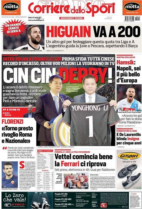 EDICOLA CDS – Cin Cin derby: Li sogna Benzema, Icardi pronto a guastare la festa Il Corriere dello Sport in edicola sabato 15 aprile 2017 regala ampio spazio al derby delle 12.30: “Cin cin derby: prima sfida tutta cinese. Record d’incasso, oltre 800 milioni la vedranno in tv. Li azzera il debito rossonero e sogna Benzema. Icardi vuole guastare la festa: ‘Vincere per dare un segnale’. Pioli e Montella caricano”. Spazio anche ad Higuain che, contro il Pescara, può toccare quota 200 reti: “Un altro gol per festeggiare questa quota tra Serie A e Liga”. The post EDICOLA CDS – Cin Cin derby: Li sogna Benzema, Icardi pronto a guastare la festa appeared first on FC Inter 1908. via FC Inter 1908 http://ift.tt/2pk2Xxb from Inter Club C’è solo l’Inter Pavia http://ift.tt/2pjSKkm