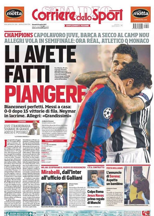 EDICOLA CdS – Mirabelli, dall’Inter all’ufficio di Galliani. Juve, li avete fatti piangere Il Corriere dello Sport dedica la prima pagina al passaggio del turno della Juventus in Champions. “Li avete fatti piangere. Capolavoro Juve, bianconeri perfetti”, si legge sul quotidiano sportivo. “Mirabelli, dall’Inter all’ufficio di Galliani”, scrive il Corriere sul nuovo direttore sportivo del Milan. Sul mercato, invece: “Colpo Roma, Jesus Navas primo regalo di Monchi”. (Fonte: Corriere dello Sport) The post EDICOLA CdS – Mirabelli, dall’Inter all’ufficio di Galliani. Juve, li avete fatti piangere appeared first on FC Inter 1908. via FC Inter 1908 http://ift.tt/2o5lLTT from Inter Club C’è solo l’Inter Pavia http://ift.tt/2pDMxml