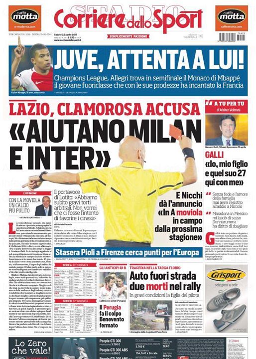 EDICOLA CDS – La Lazio accusa: “Gli arbitri aiutano Milan e Inter per favorire i cinesi” [fncvideo id=881657] Prima pagina bollente quella del Corriere dello Sport. Sulla testata del quotidiano sportivo, infatti, è riportata la clamorosa accusa da parte della Lazio nella persona di un portavoce del presidente biancoceleste Lotito, che avrebbe detto, come titola i giornali: “Gli arbitri aiutano Milan e Inter. Il portavoce di Lotito: ‘Abbiamo subito gravi torti arbitrali. Non vorrei che ci fosse l’intento di favorire i cinesi”. Il giornale poi scrive, parlando di campo: “Stasera Pioli a Firenze cerca punti per l’Europa”. (Fonte: Corriere dello Sport) The post EDICOLA CDS – La Lazio accusa: “Gli arbitri aiutano Milan e Inter per favorire i cinesi” appeared first on FC Inter 1908. via FC Inter 1908 http://ift.tt/2p0DVDz from Inter Club C’è solo l’Inter Pavia http://ift.tt/2p0EE7R