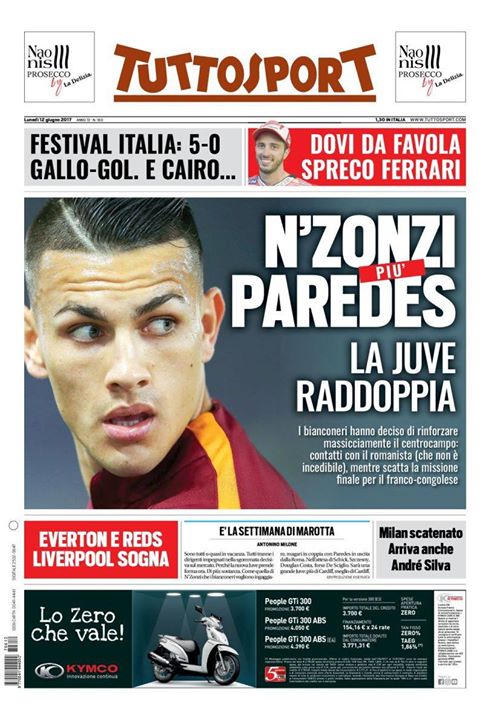 EDICOLA TS – Juve, contatti con Paredes che non è incedibile. Milan scatenato Sulla prima pagina di TuttoSport tra qualche ora in edicola spazio al mercato. Il quotidiano si concentra in particolare sulla Juventus che, a quanto pare, sembra sia vicina N’Zonzi (ormai da giorni) e a Paredes. “La Juve raddoppia: i bianconeri hanno deciso di rinforzare massicciamente il centrocampo. Contatti con il romanista (che non è incedibile), mentre scatta la missione finale per il franco-congolese”, scrive il quotidiano. Sul Milan, invece: “Milan scatenato, arriva anche André Silva”. Il giocatore domani potrebbe sostenere le visite mediche (clicca qui per leggere). (Fonte: TuttoSport) The post EDICOLA TS – Juve, contatti con Paredes che non è incedibile. Milan scatenato appeared first on FC Inter 1908. via FC Inter 1908 http://ift.tt/2taoY2A from Inter Club C’è solo l’Inter Pavia http://ift.tt/2rg1axY
